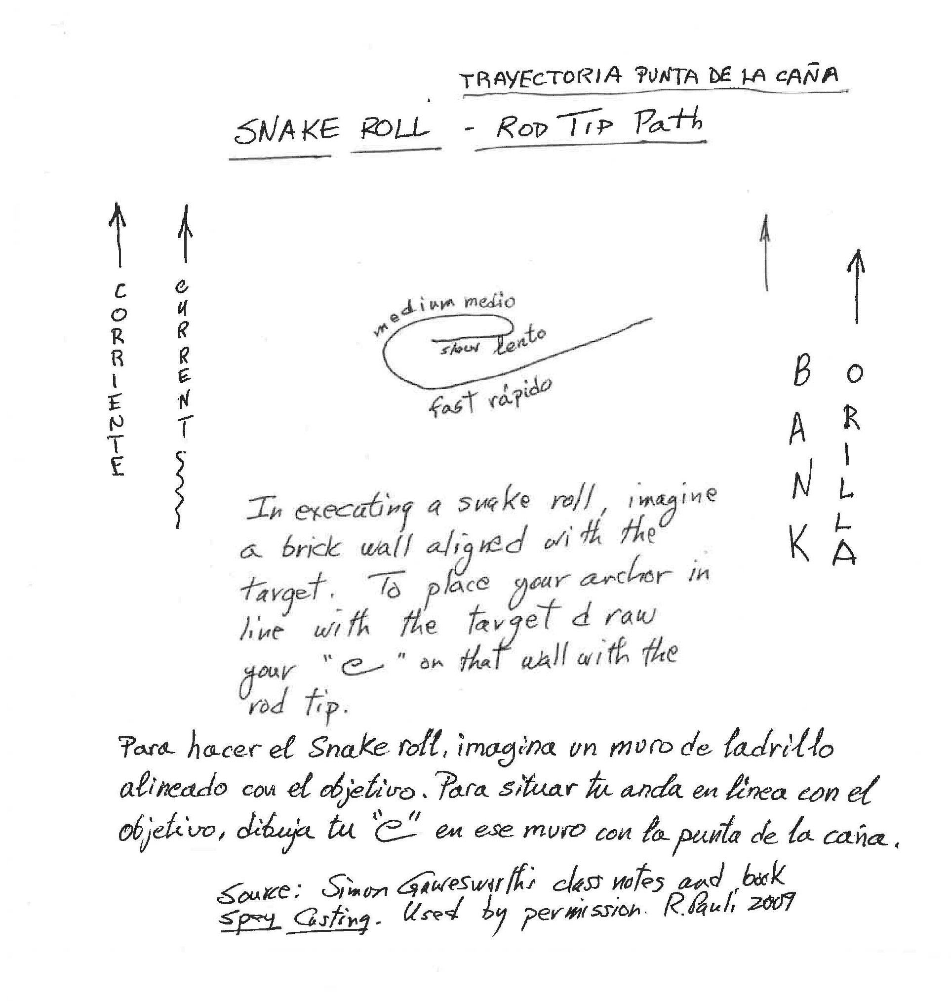Imagínate un neumático rodando aguas arriba por el medio del río. La dirección de rotación del neumático es la misma dirección de rotación que la punta de tu caña describe durante un snake roll.