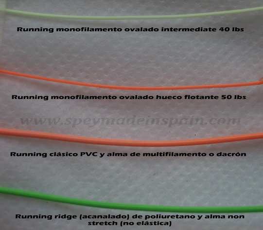 Algunos runnings más de tipo plástico. El Opti de Loop no es de perfil paralelo como la mayoría, sino ahusado. El SharkSkin de Scientific Anglers se distingue por su típica textura de piel de tiburón cuyo roce con las anillas produce un característico sonido de silbido bastante grimoso para algunos.