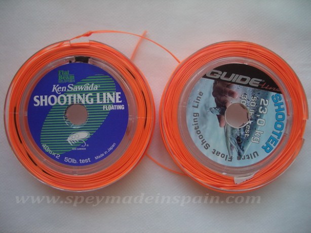 Running monofilamento ovalado hueco flotante. Dos de los más usados. GL Shooter de Guideline y el de Ken Sawada. 30, 35, 40 y 50 lbs son las resistencias más utilizadas para la pesca del salmón.